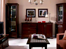 Кентаки - мебель классического стиля, отличающаяся природными цветами, отделкой, фактурой, всегда актуальна и востребована, она настолько универсальна, что без проблем впишется в любой современный дизайн. Стиль набора модульной мебели подчеркивается лакированной патинированной планкой в фасадах, карнизами - завершающим акцентом в зеркалах и высоких элементах набора, витиеватыми ручками.