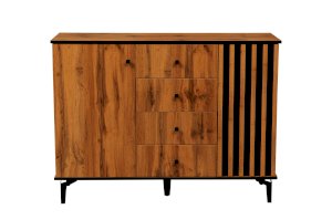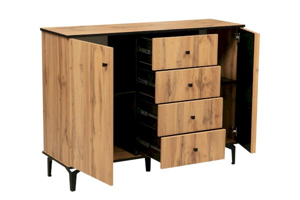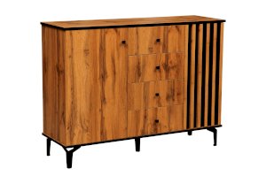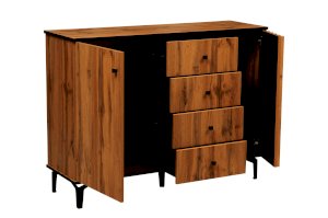 По краям – справа и слева – за распашными дверцами находятся полки, а в середине – четыре выдвижных ящика. Однако в середине – это не значит, что в центре. Принцип асимметрии здесь ярко выражен. Левая часть комода самая широкая, правая – гораздо уже. А пространство между ними отдано под выдвижные ящики. Таким образом, самая вместительная часть комода находится слева, за однотонной распашной дверцей цвета дуба Вотан. Внутри – два отделения – больших и вместительных, сюда поместятся объемные вещи. Каждая полка из ЛДСП выдерживает до 5 кг. В правой стороне места чуть поменьше – за счет ширины полок, но вполне достаточно, чтобы разместить, например, коробки с обувью или сложить вещи или постельное белье. Выдвижные ящики предназначены для хранения менее габаритных вещей. В зависимости от тематики помещения в них можно разложить бумаги, документы, нижнее белье, полотенца. На верх комода можно поставить телевизор, а если повесить над ним зеркало и на столешнице расставить духи и косметику, он превратится в туалетный столик!