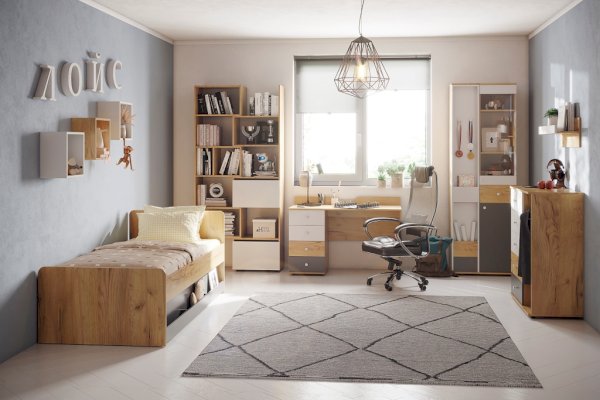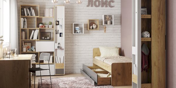 Стол письменный отличается нестандартным решением для столешницы, которая максимально адаптирована для потребностей современных детей и работе на компьютере. Под откидной её частью, которая открывается за плавный вырез, прячется ниша для хранения и отверстие с заглушкой для вывода проводов, чтобы они не запутывались и не мешали ребенку. Если ребенок ещё не занимается за компьютером, то нишу можно использовать и для размещения органайзеров с карандашами, фломастерами и красками, чтобы они не отвлекали от творчества. Дополняют стол ящики на шариковых направляющих. За счет просторной рабочей поверхности, а также возможности левосторонней и правосторонней сборки письменный стол одинаково удобен как для левши, так и для правши.