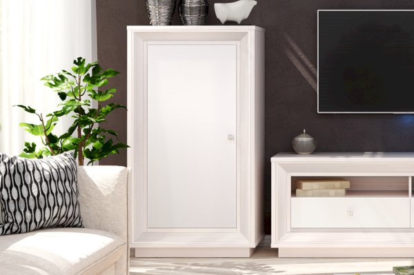Материал корпуса изделия ЛДСП толщиной 25 мм - крышка, дно и боковины и толщиной 16 мм - полки и цоколь. Кромка ПВХ толщиной 2 мм применяется на основных деталях конструкции. Мебель в стиле Ар-деко отличает элегантная декоративная отделка в виде МДФ багета в пленке ПВХ с сатиновым эффектом «Жемчуг», в таком же исполнении на изделии красуется фасад с изысканной ручкой цвета «венецианское серебро».
