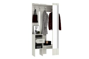 «Агата» создана для Вашей прихожей – Вы можете повесить одежду и сумку на металлические крючки, шляпки положить на полку сверху, нужные мелочи – в выдвижной ящик. На открытых полках можно разместить зонты, перчатки и шарфы. Лицевая панель с зеркалом во весь рост обеспечит комфорт и уют Вашей прихожей. «Агата» - стильная, функциональная, занимает минимум пространства.