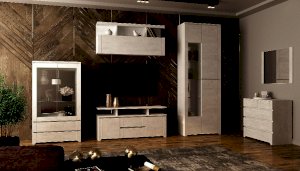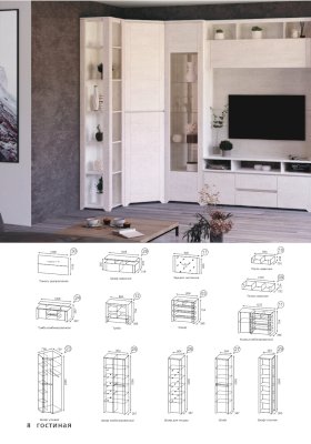 В центре модульного набора будет отлично смотреться ТВ-секция с навесной полкой. Шкафы-серванты с зеркальными дверцами позволят Вам расположить сервиз, предметы декора и книги. Вместительный комод с навесным зеркалом станут идеальным дополнительным вариантом для хранения одежды, белья и других личных вещей.