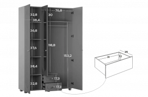 — слева расположены полки для сложенной одежды, коробок или игрушек;