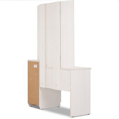 Самое первое - несоответствие цвета. В карточке товара и на фото указан белый, по факту это не так. Стол заказывался под остальную белую мебель, теперь придется искать решение. Второе - неотработанный край лдсп на центральном зеркале. Это некрасиво и бросается в глаза.