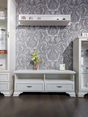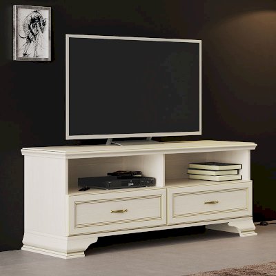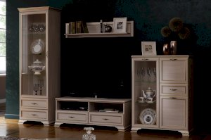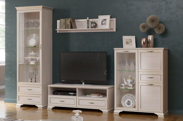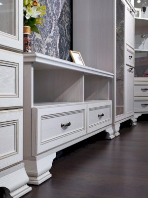Если вы подбираете к покупке стенку в гостиную в классическом стиле, вам непременно понадобится такой модуль как ТВ-тумба. Модуль имеет удобную конструкцию с двумя выдвижными ящиками для хранения различных вещей. Открытые ниши удобны для размещения аппаратуры.