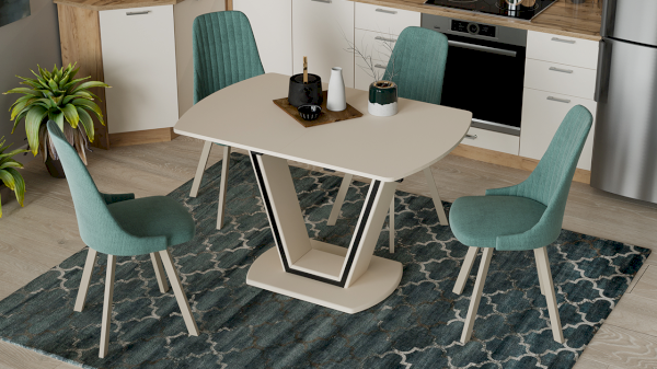 Новинка имеет надежный ручной синхронный механизм раздвижения со вставкой «бабочка», которая укладывается вручную. Это выручает в моменты прихода гостей, которых хочется разместить свободно и с комфортом. Дополнительная вставка со стеклом в цвет столешницы продолжает элегантный образ изделия, делая его целостным и завершенным.