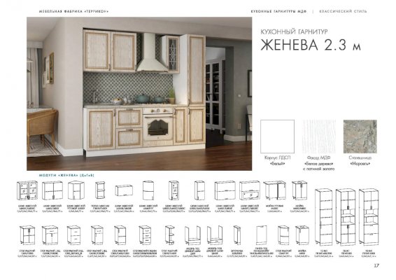 Кухонный гарнитур «Женева» превращает процесс приготовления пищи в настоящий праздник. В комплект входят все модули, необходимые для правильной организации пространства кухни. Удобная и красивая мебель вдохновляет человека на создание кулинарных шедевров. Изящные рисунки на стеклянных дверцах навесных шкафчиков наполняют классический стиль особым шармом.