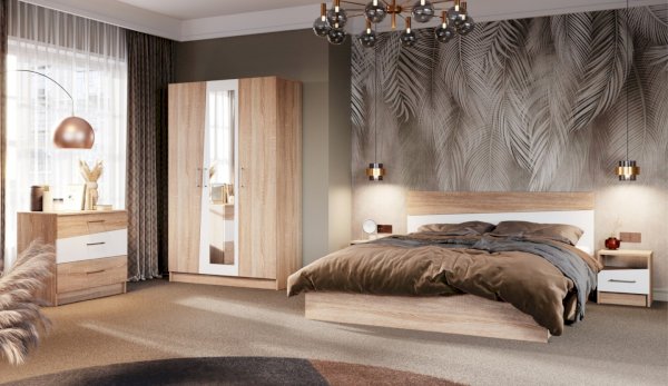 Спальня Антария – это дух творчества и самобытного стиля. Нестандартные фасады ЛДСП с асимметричными скошенными линиями вносят свободу и движение в жилое пространство, делают интерьер более сложным и необычным, придают характер и индивидуальность. Декор фасадов повторяет цвет и рисунок натурального дерева. Оптимальный набор модулей поможет вам создать яркий и функциональный интерьер, отражающий ваши вкусы и предпочтения.