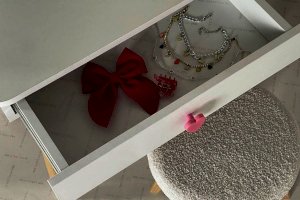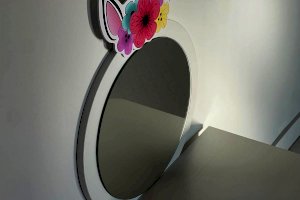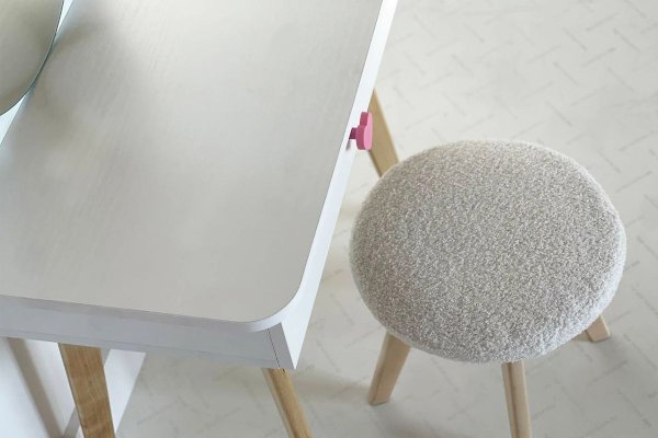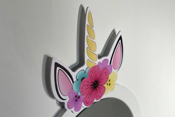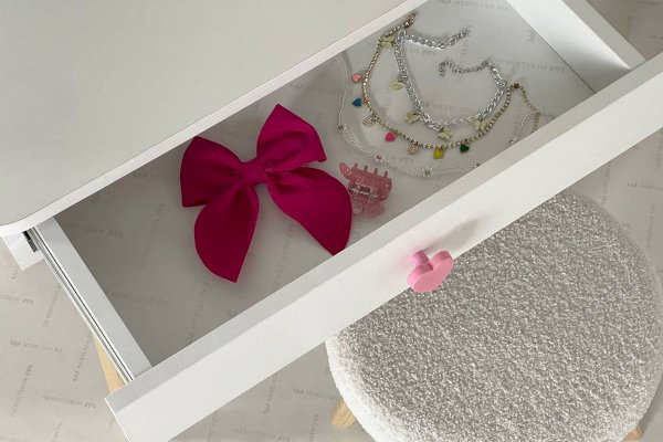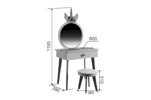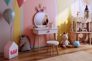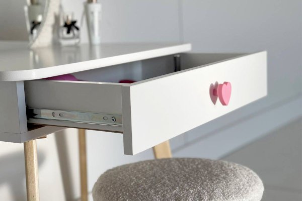 Комплект многофункционален: девочка может наводить красоту, смотрясь в круглое зеркало, декоративный элемент "Единорожку" можно использовать как крючки для украшений, на столешнице разложить все нужные и важные вещи для марафета или лепить из пластилина и рисовать. В выдвижной ящик на шариковых направляющих складывать необходимые вещи. Тактильно приятная на ощупь ручка в форме сердечка, никого не оставит равнодушным, к ней захочется прикасаться все снова и снова.