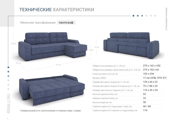 Шагающий механизм трансформации пантограф прост и надежен; при раскладывании не портит напольное покрытие. Модель также оборудована двумя вместительными бельевыми ящиками: в диване и оттоманке.