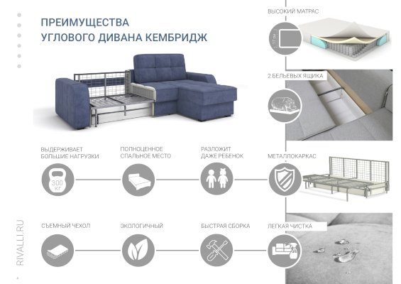 В основе Кембриджа металлический каркас из конструкционной стали с высокими эксплуатационными свойствами и повышенной гарантией от производителя, который выдерживает большие нагрузки: 200 кг на общее место для сидения, 300 кг на общее спальное место. Диван - идеальный вариант для ежедневного сна за счет широкого ровного спального места и высокого анатомического матраса ЛЮКС с ортопедическим эффектом.