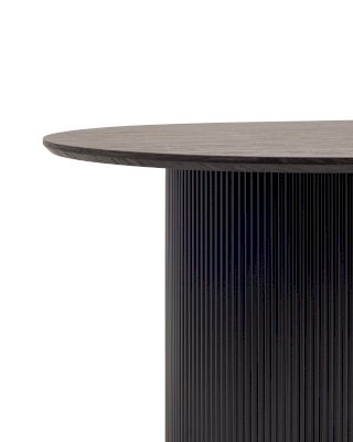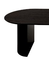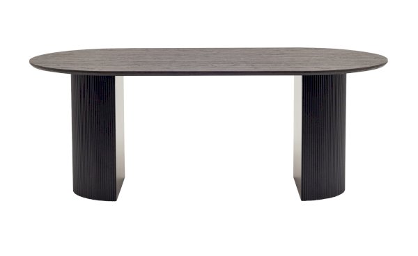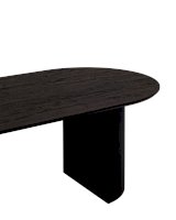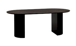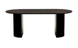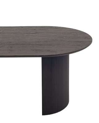Столешница выполнена из прочного и долговечного МДФ. Темная поверхность столешницы гармонично сочетается с массивными ножками черного цвета. Простая овальная форма стола позволит легко вписать его в современный интерьер, стол украсит кухню, гостиную или современное кафе, ресторан. Опорные плиссированные ножки в лаконичном дизайне надёжно удерживают всю конструкцию и дополняют монолитный образ.