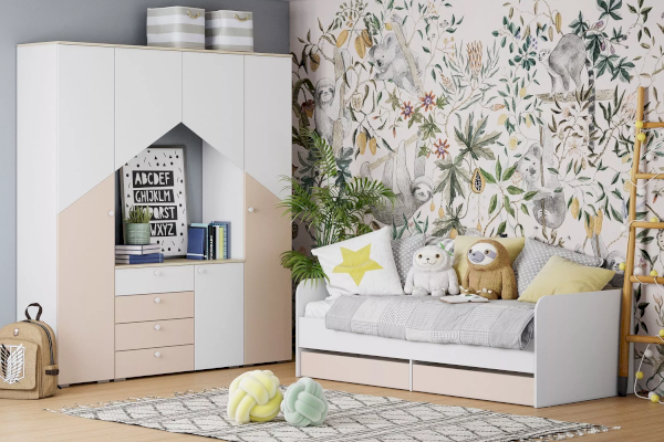 Шкаф комбинированный Банни представляет собой 2 шкафа для одежды соединённых между собой навесной полкой с двумя дверцами. Скругленные ручки-кнопки не имеют острых граней.