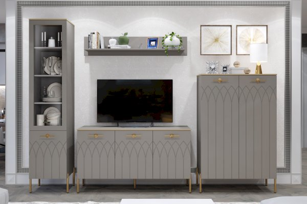 Большой комод - модное решение для современного интерьера. Мягкие серые оттенки «мокко» и «силк анис» сочетаются с золотым декором и яркой лицевой фурнитурой.