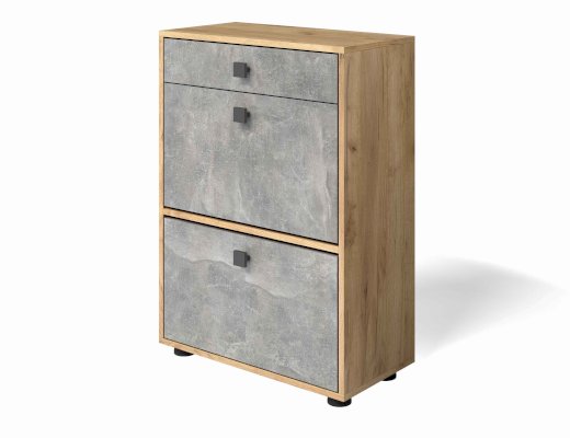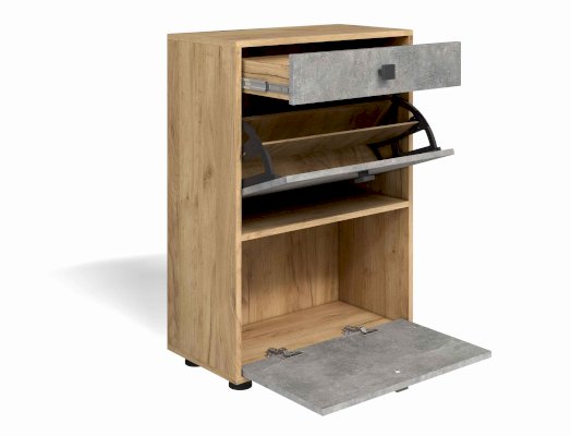 Недорогая обувница с двумя откидными секциями под обувь (вместительность до 8 пар обуви) и одним выдвижным ящиком для хранения аксессуаров и других полезных мелочей.